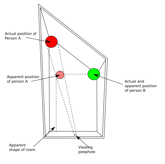 A special type of perspective illusion that employs simulated (adjusted real-space structure) and synthetic perspective (combination of visual [retinal perspective] and natural/environmental perspective) in which a room is employed with a distorted shape so as to be magnified in scale towards one corner. People or spatial objects that move, or are moved across, the room appear to grow or shrink in apparent size.