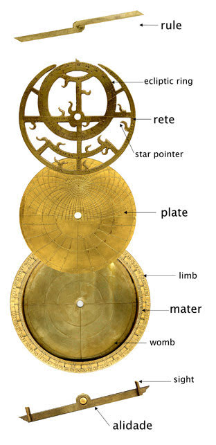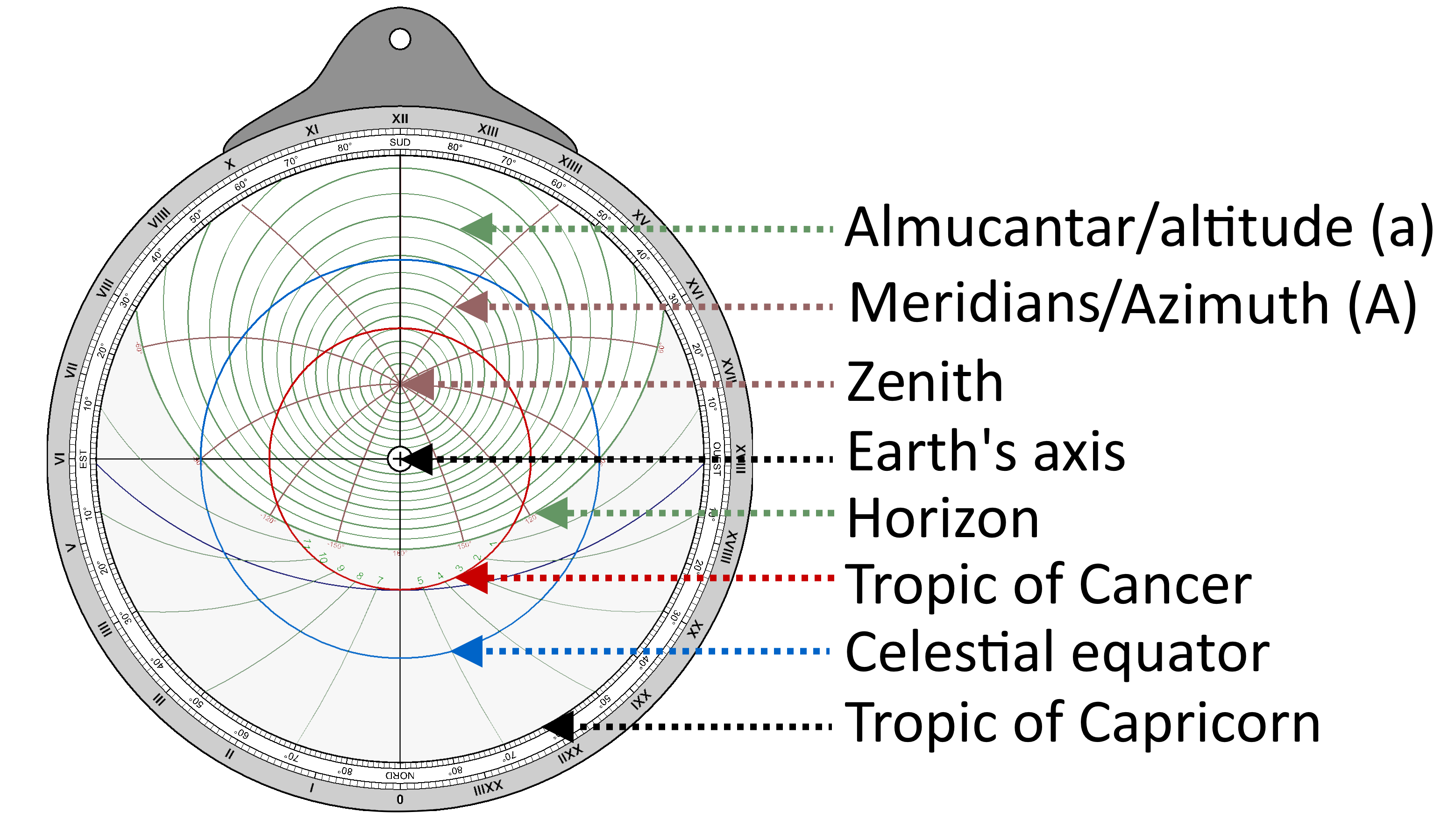 An astrolabe consists of a flat disk, called the mater (mother), which is deep enough to hold one or more flat plates called tympans, or climates. A tympan is constructed for a specific lattitude and is engraved with a stereographic projection of circles denoting observer azimouth and altitude and representing the portion of the celestial sphere above the local horizon. The rim of the mater is typically graduated into hours of time, degrees of arc, or both.