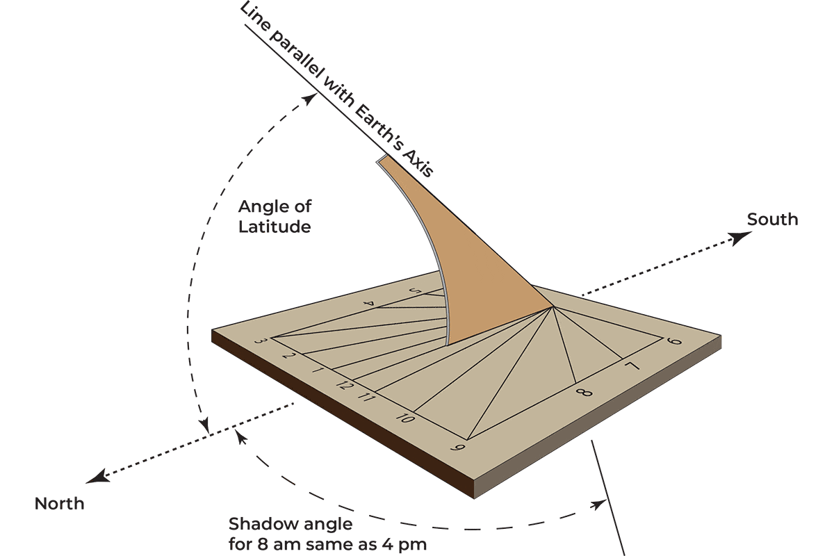 In simplest form, a sundial consists of a flat plate (the dial) and a gnomon, which casts a shadow onto the dial. As the motion of Sun changes through the sky, the shadow aligns with different hour-lines, which are marked on the dial to indicate the local time. The gnomon may be a rod, wire, or decorated metal casting or arrow. The gnomon casts a shadow to show the time. The style is the time-telling edge of the gnomon, and it must be aligned parallel to the axis of the Earth’s rotation for the sundial to be accurate throughout the year.