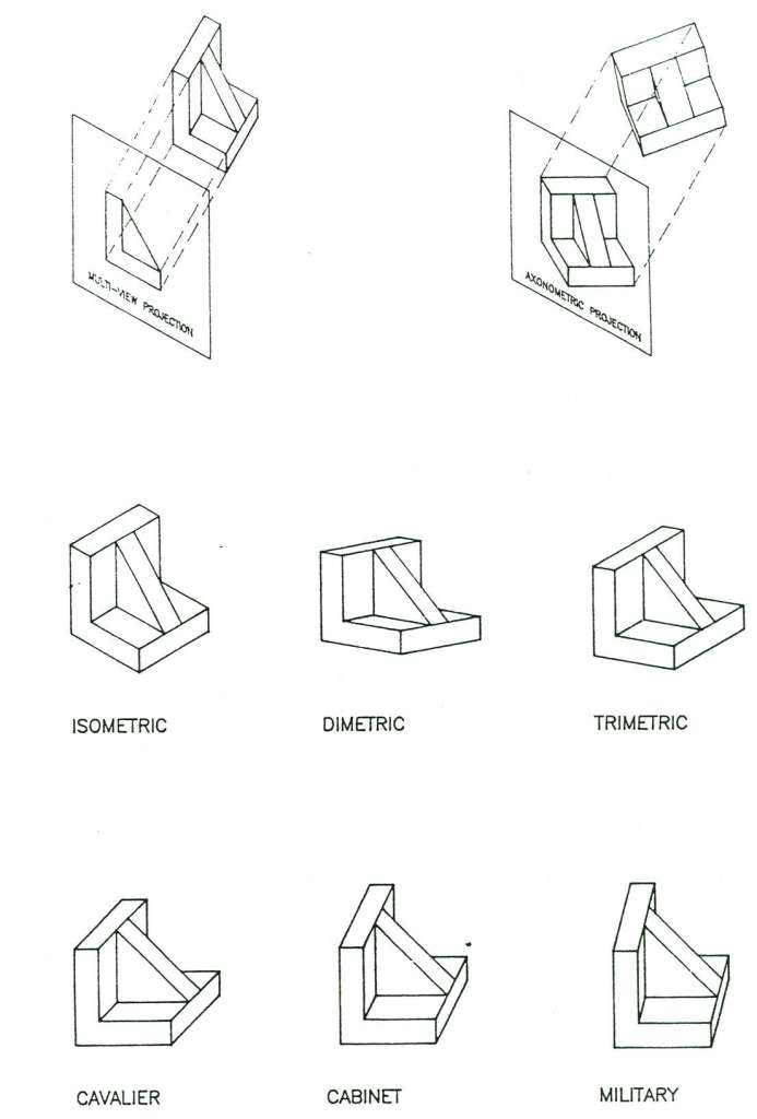 Axonometric projection (fig. 7.2) is subdivided into isometric, dimetric and trimetric projection. In isometric projection all three faces are equally oblique (fig. 7.2). In dimetric, two faces are equally oblique (fig. 7.3). In trimetric, only one face is equally oblique (fig. 7.4). In addition, there are two other oblique parallel projections known as cavalier projection, where the object is at 45 degrees relative to the picture plane (fig. 7.5) and cabinet projection, where the object is at arc tan 2 relative to the picture plane (fig. 7.6), and some include a third, military projection (fig. 7.7).