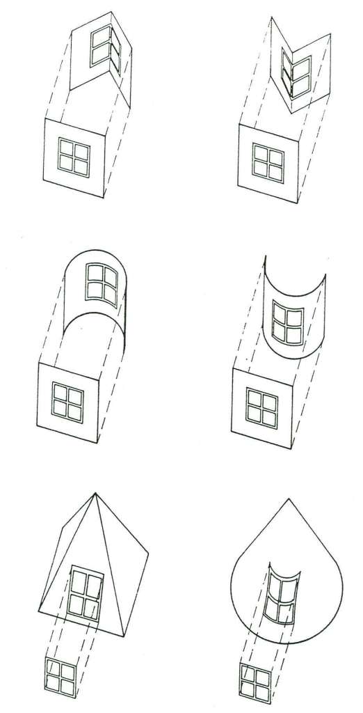 In this diagram, we see warped geometry of picture planes, with picture plane shown on right for each diagram (11.1-2: folded picture planes, 11.3-4: cylindrical picture planes, 11.5-6: pyramidical and conical picture planes).