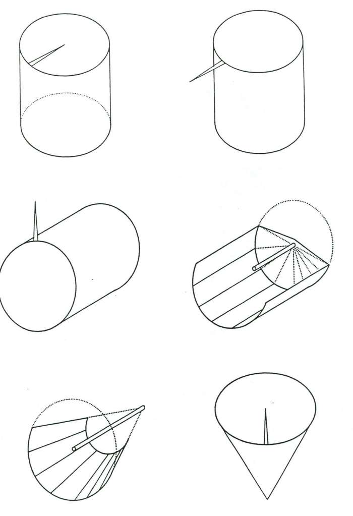 In the meantime thinkers explored the characteristics of various other types of planes. The simplest of these was a concave V-shaped projection plane consisting of two converging rectilinear planes (fig. 11.1). Marolois (1614), described this possibility which was actually used in a peep show of a church interior now in the National Gallery at Copenhagen. Bosse also considered the converse: a convex V- shaped projection plane again consisting of two rectilinear planes (fig. 11.2). Corresponding cylindrical shapes both convex and concave were also explored by the author of the Codex Huygens, Marolois, Nicéron and Schott (fig. 11.3-4). Other variants, probably based on concepts of visual pyramids, involved rectilinear and curvilinear pyramids or cones. Dubreuil (1649) considered frontal projections onto both their exteriors and interiors (fig. 11.5-6).