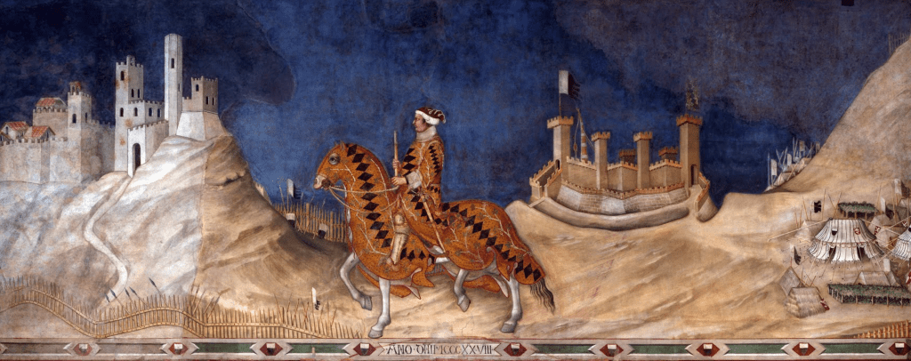 Our concern here is not to enter into the lively debates whether these fortresses can be identified specifically as Montemassi and Sassoforte; whether they are merely part of a symbolic landscape or both, but simply to note that, notwithstanding connections between art and the military, fourteenth century paintings contained few stategic landmarks or recognizable buildings. Some would say that this was because the concept of mimesis, in a new sense had not yet reestablished itself.
