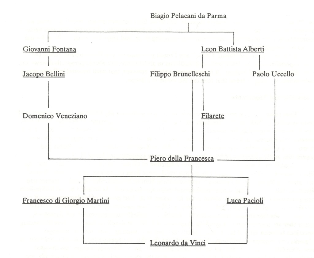 Looking at the fifteenth century as a whole we find there were only seven authors whose works are extant (fig. 44). All their fifteenth century manuscripts together amount to 34. Published material was limited to seven pages in Luca Pacioli’s Compendium of arithmetic, geometry, proportions, and proportionality (1494). Only one treatise, Piero della Francesca’s On perspective of painting actually had perspective in its title. All the authors were Italian. There were four main centres: Florence, Venice, Milan and Rome. Connected with these were other cities: Padua, Mantua, Bologna, Pisa, Siena, Urbino, Perugia and Naples. The theoreticians moved with surprising freedom. Alberti worked in Venice, Mantua, Bologna, Florence and Rome. Luca Pacioli sojourned in Venice, Urbino, Milan, Perugia, Florence, Rome and Naples. Leonardo worked in Florence, Milan, the Romagna, Rome and Amboise.