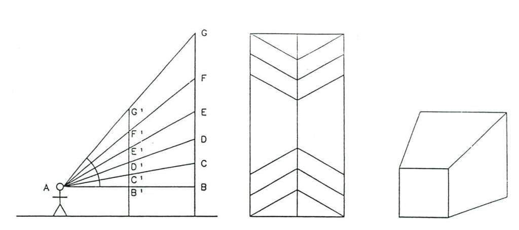 These are again pseudo-perspectival methods variously termed negative perspective, optical adjustments or visual angles methods (figs. 2, 4). According to Pennethorne, the method of making objects higher in order that they appear the same size was used in the temple of Thebes in the 13th century B.C. and with the letters on the temple of Priene in the 5th century B.C.
