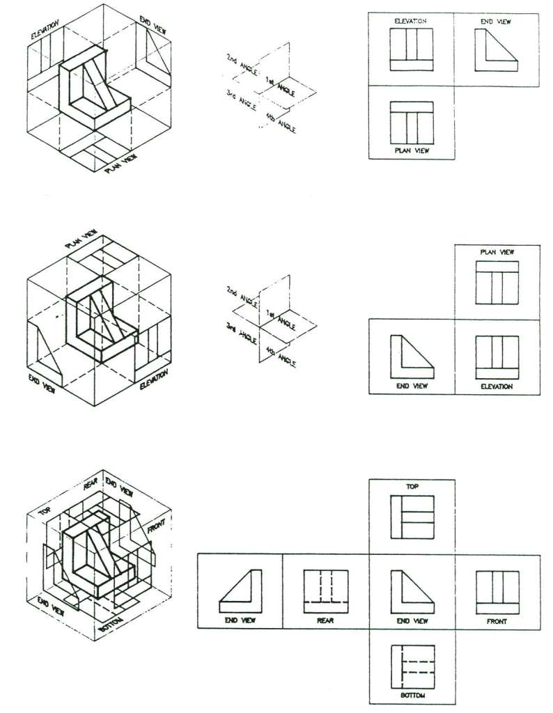 Multiview projection may involve first angle (also termed first quadrant) projection, commonly used in Britain (fig. 6.3 cf. fig. 6.2), where one looks out at the projection: or third angle projection, commonly used in the United States (fig. 6.5), where one looks in at the projection as if it were in a transparent glass box (fig. 6.7).