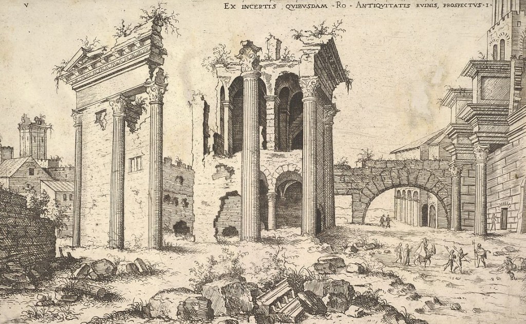 Meanwhile, other modern artists were adding this element of context to what had hitherto been studies of single columns, individual architectural elements or, at best, isolated monuments. The sketchbooks of Maarten Heemskerck and Francisco de Hollanda gave perspectival views, or vedute, of Roman ruins in their original settings. Hieronymous Cock was another Northerner who probably visited Rome in the period 1546-1548. His Some of the principal monuments of ruins (1550) was one of the first of these collections of views (vedute) to be published. A decade later they were reproduced, without acknowledgement, by Pittoni.
