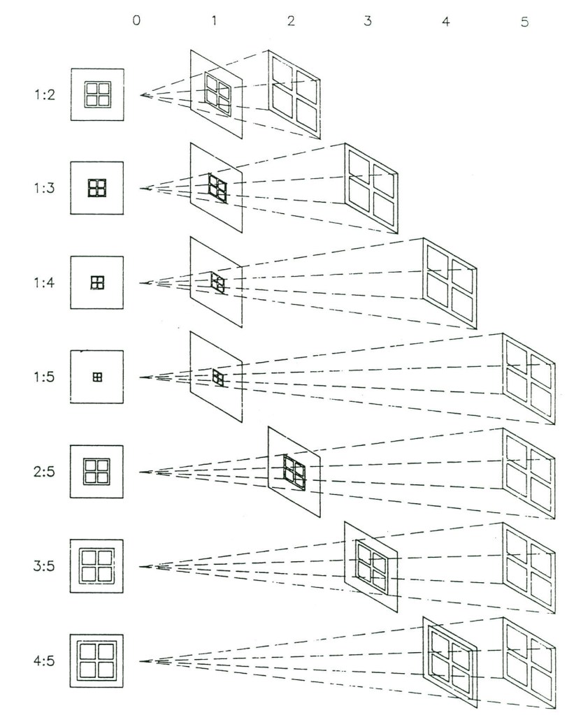 In this process there are three variables: eye, picture plane and object. Normally two variables are kept constant while a third is moved systematically. If the object is moved away from the eye the object’s projected size becomes proportionately smaller. If the picture plane is moved away from the eye, the object’s projected size becomes proportionately larger. If the eye is moved away from the object and picture plane, the object’s projected size becomes proportionately larger, while other objects at right angles to the picture plane become increasingly foreshortened (fig. 2).