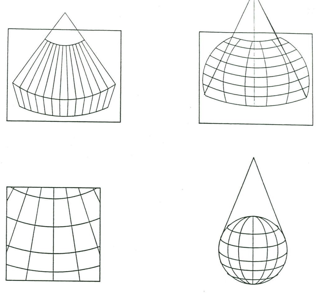 Not all projections were rectilinear. Mercator projected the sphere onto a cylinder to arrive at his now famous grid system (fig. 17.1-2).