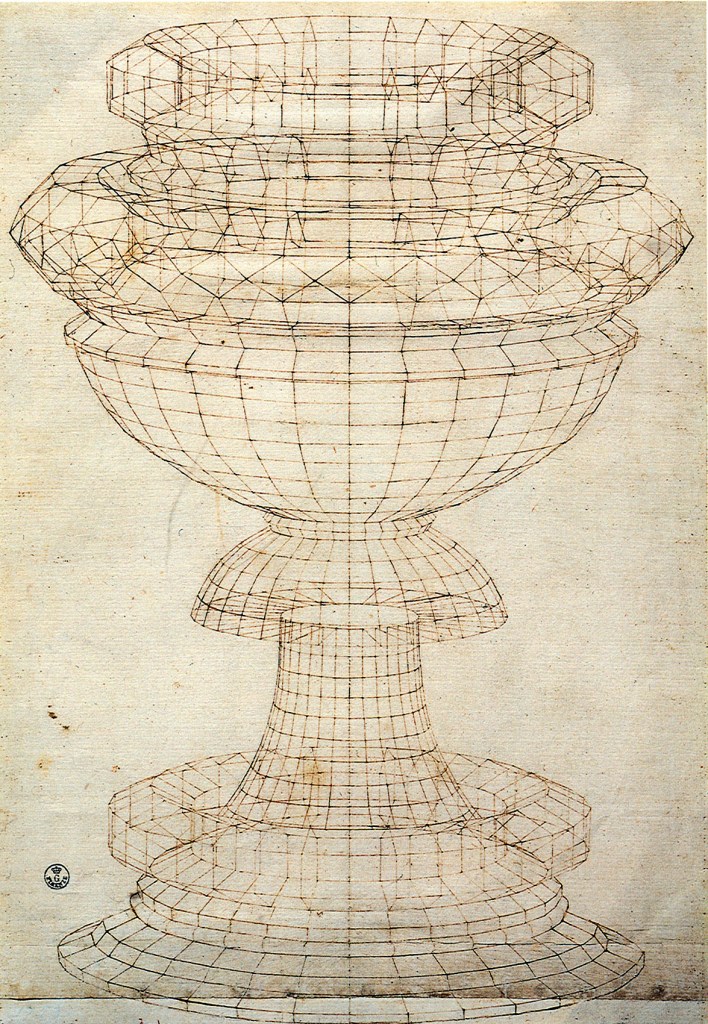 This applied equally to practitioners. Masolino, for instance, worked in Florence, Prato, Rome, Castiglione d’Olona from whence he accompanied Cardinal Branda Castilione to Hungary and worked for King Matthias Corvinus. All this helps to explain the lack of manuscripts. Artists invariably worked together in workshops (botteghe) and generally would have learned their theory by word of mouth from the travelling experts. So, although perspective was technically limited to a dozen theoreticians moving between as many cities, the impact was larger. In retrospect, however, it is necessary to keep reminding ourselves just how small was the scale of the phenomenon if we are to appreciate, for instance, Luca Pacioli’s complaint that after Leonardo left Milan in 1499 he was unable to find anyone who could draw the semi-regular solids for his Divine proportion in proper perspective.