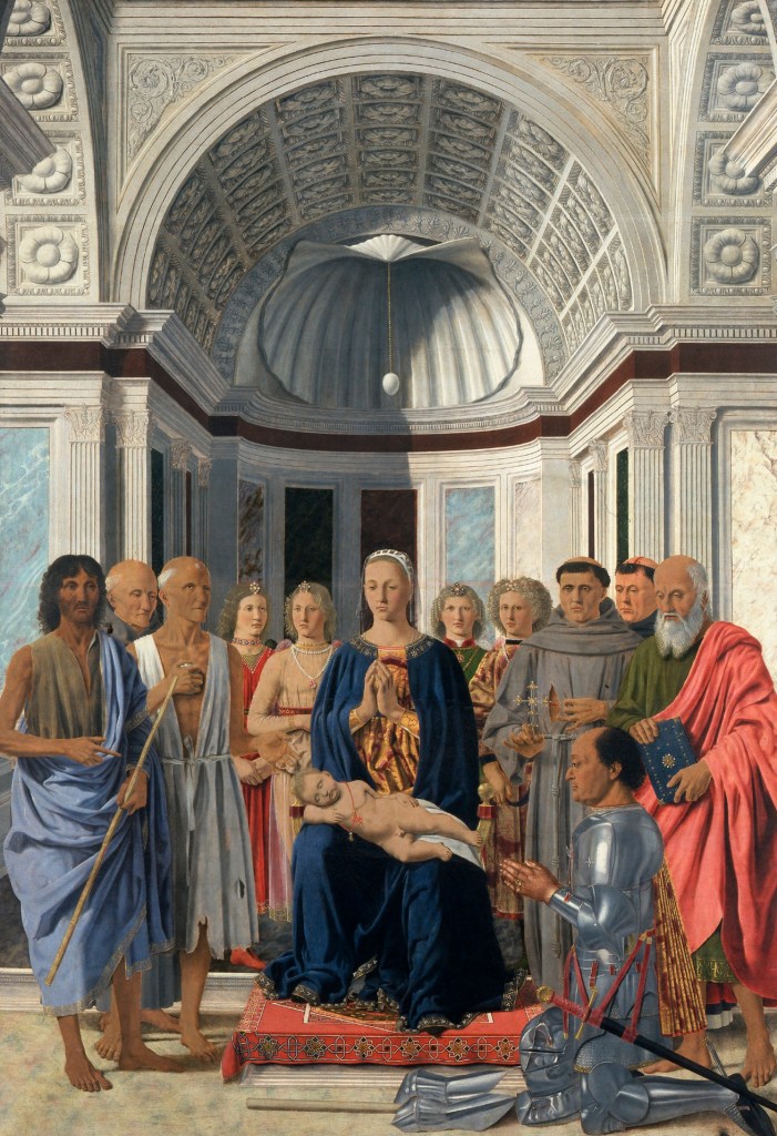 A cumulative process marks a next stage in development. Hence, Piero della Francesca, having mastered the dome shape and the cassetted vault, produced an inverted dome in the form of a scallop and combined this with a cassetted vault in his famous Brera Altar (Fig .23). Artists at all levels were involved in this process. In his doors for the Baptistery at Florence, Ghiberti had represented a cross vault. This form also appeared in the treatises of Piero della Francesca and Sebastiano Serlio. A derivative painter such as Cima da Conegliano in turn combined a cross vault with a cassetted barrel vault in his St. Peter Martyr and Saints.
