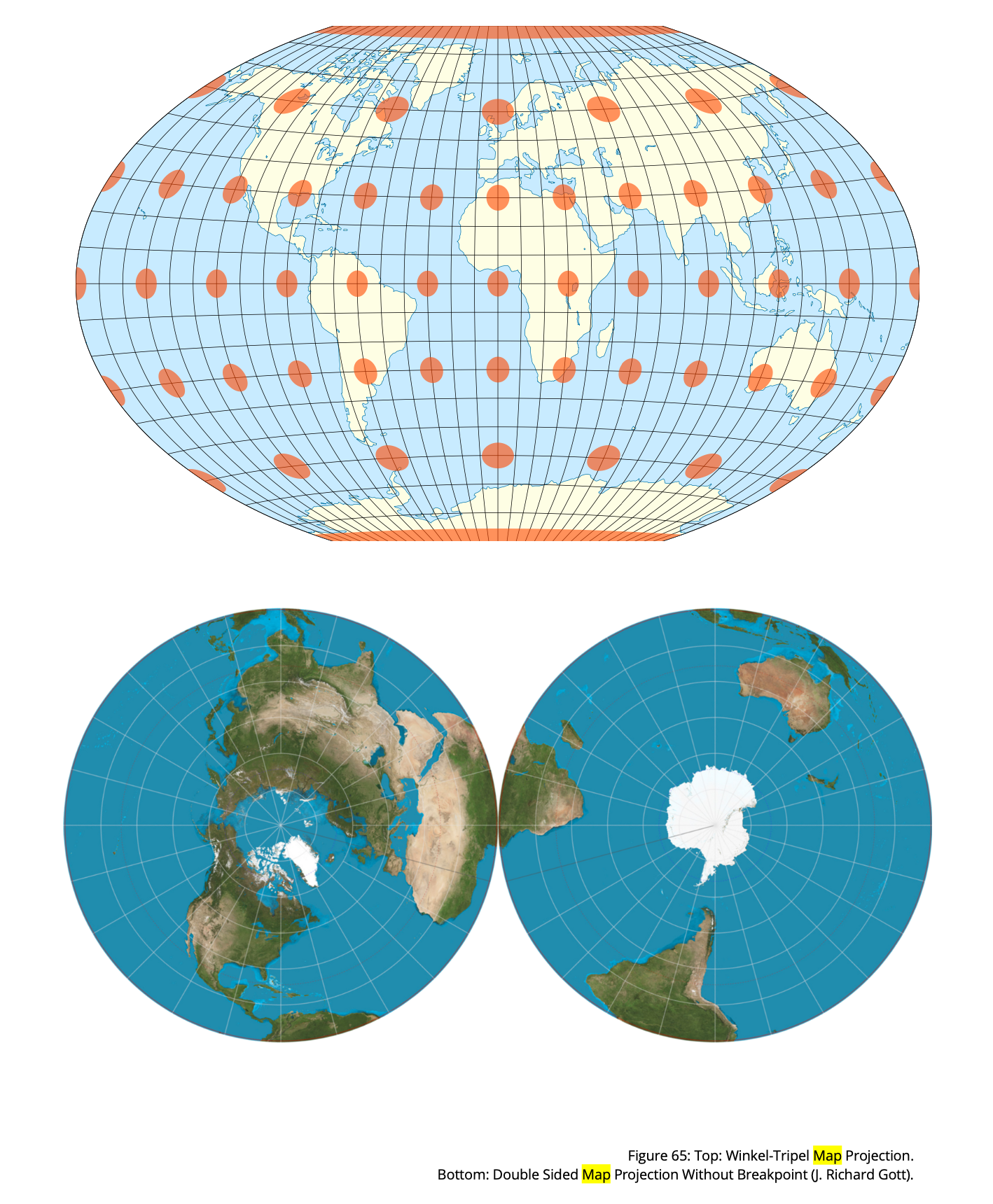 Dr. Gott wanted to strike a balance between the three kinds of errors: size, shape, and distance, and he worked out a scoring system that could sum these different kinds of error. He then examined all possible projections and found the one that minimised the sum of the three types of error: the Winkel-Tripel projection. However, a distortion persisted being a mathematical incision line or breakpoint, often running from pole to pole down the Pacific. The resulting shape cannot be stretched and pulled back over the unbroken surface of a sphere.