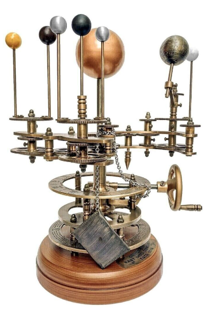 An orrery is a mechanical model of the Solar System that displays the relative positions and motions of the planets and (larger) moons. It sometimes represents the relative sizes of these bodies; however, accurate scaling is often not possible due to the actual large ratios involved, so a scaled-down version is employed. The Greeks had working planetaria or planetariums; which is a theatre built for producing educational shows about astronomy and the night sky; however, the first modern version was produced by John Rowley in 1712.
