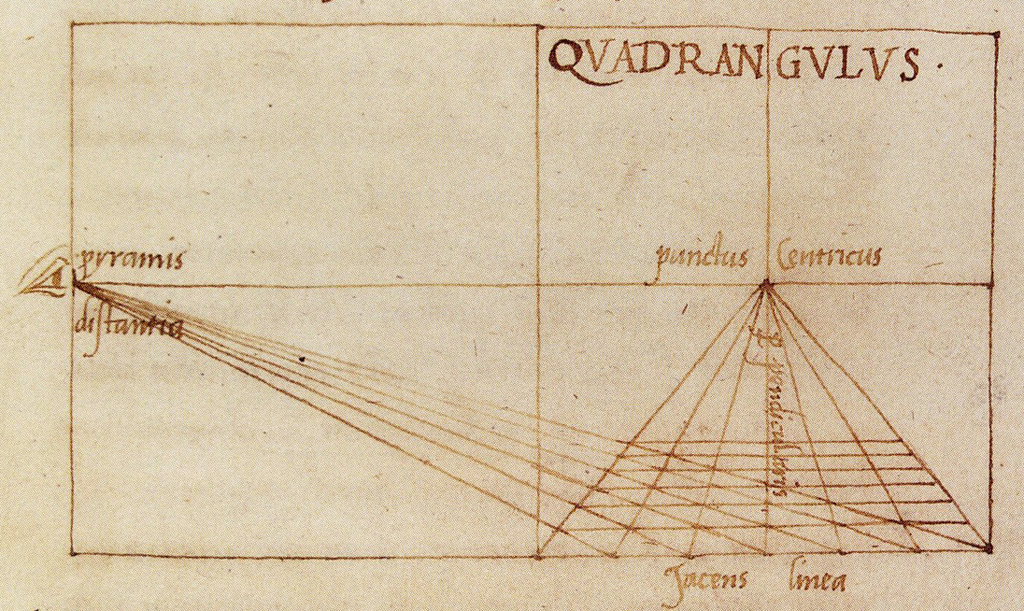 Whatever the steps involved in the establishment of its modern meanings, by the 1480’s Brunelleschi had developed what painters today call ‘perspective’—a series of methods of graphic representation of a three-dimensional scene (typically 2D view of a 3D scene); as opposed to the overlaid processes of purely ‘visual perspective‘ employed when looking directly at a scene.
