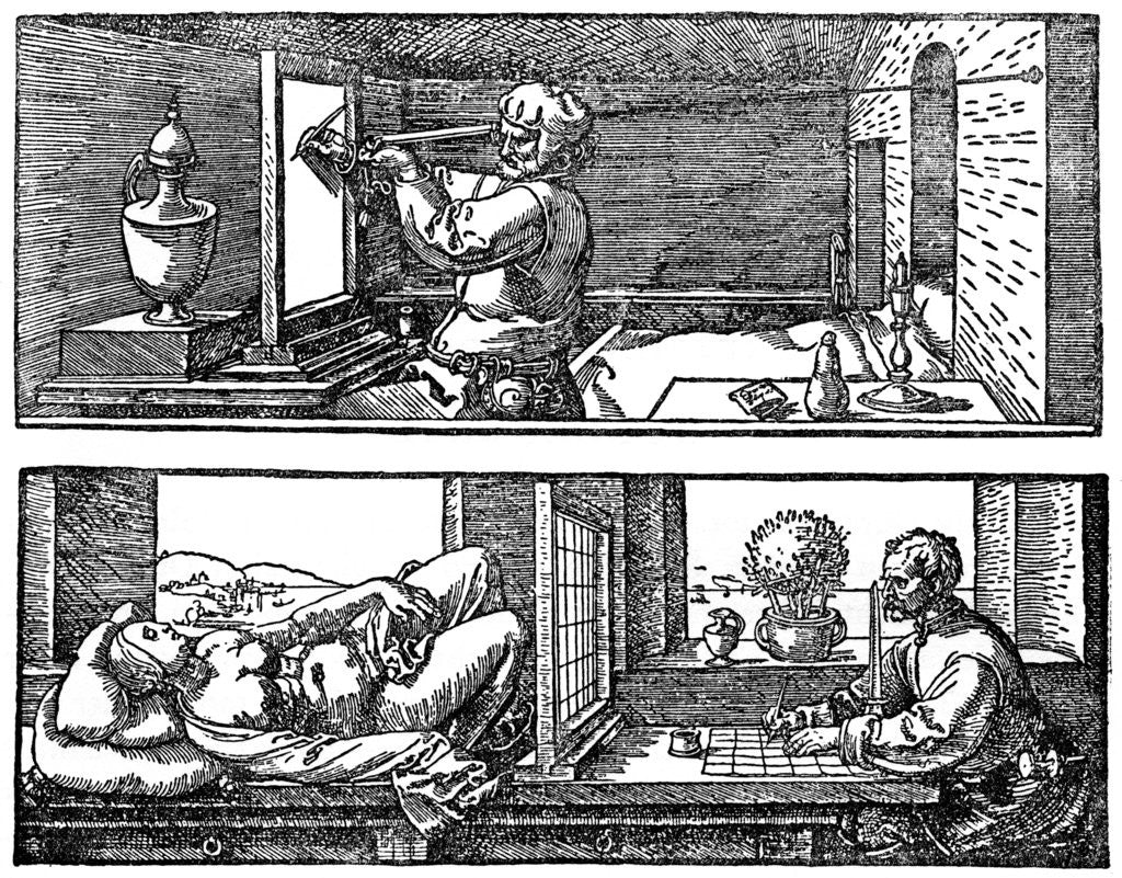 Often the frame would be cross-indexed with a checkerboard pattern of strings, or have ruled markings on the edges, and sometimes another upright stick would fix the artist’s eye position, field-of-view, and direction of looking.