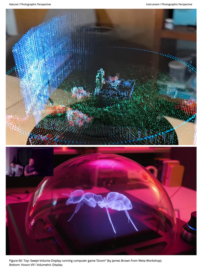 Still other kinds of displays are possible, for example, projection onto retina, and andotrope, etc. See: 3-D, 3-D perspective (1, 2, 3, 4), volume display, andotrope, fan-hologram, BOOM, visual perspective.