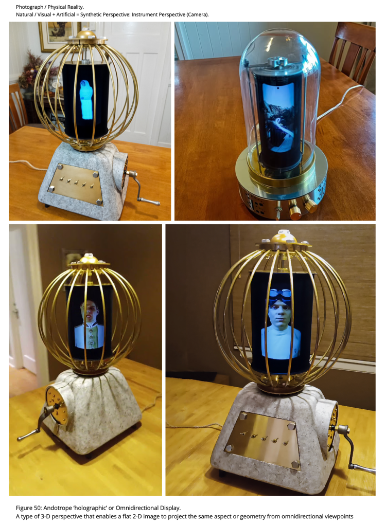 The result is a flat or 2-D moving image that can be seen in the same aspect or appears from an identical fixed viewing direction, but as seen from omnidirectional viewpoints or multiple station points, that is the 2-D image looks identical in perspective projectional terms from a full 360 degree point-of-view. See Figure 3 for a photograph of a working Andotrope display.