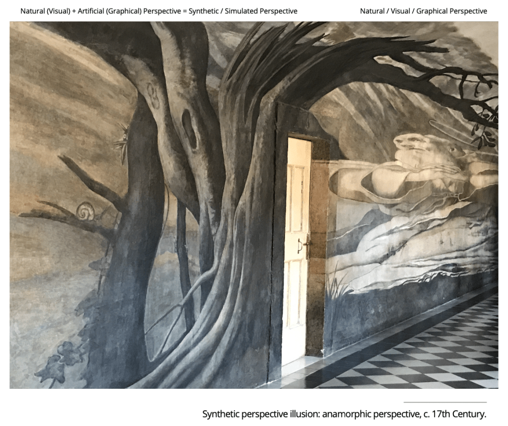 - Virtual Constructed Linear Perspective (new media embodiment): when we use a special kind of optical system, to project a spatial scene/object according to the appearance rules of 1-2-3 point perspective (Virtual / Extended Reality for example).