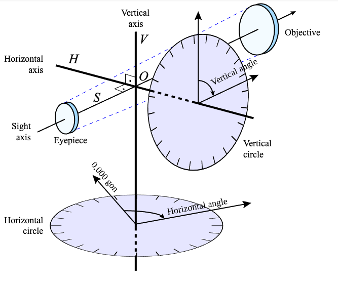 - Telescope: A theodolite has a telescope with horizontal and vertical circles marked with graduations.